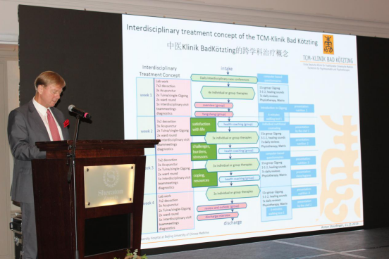 (德国魁茨汀中医院总经理施道丁格尔先生为大家介绍德国魁茨汀中医院28年发展历程)