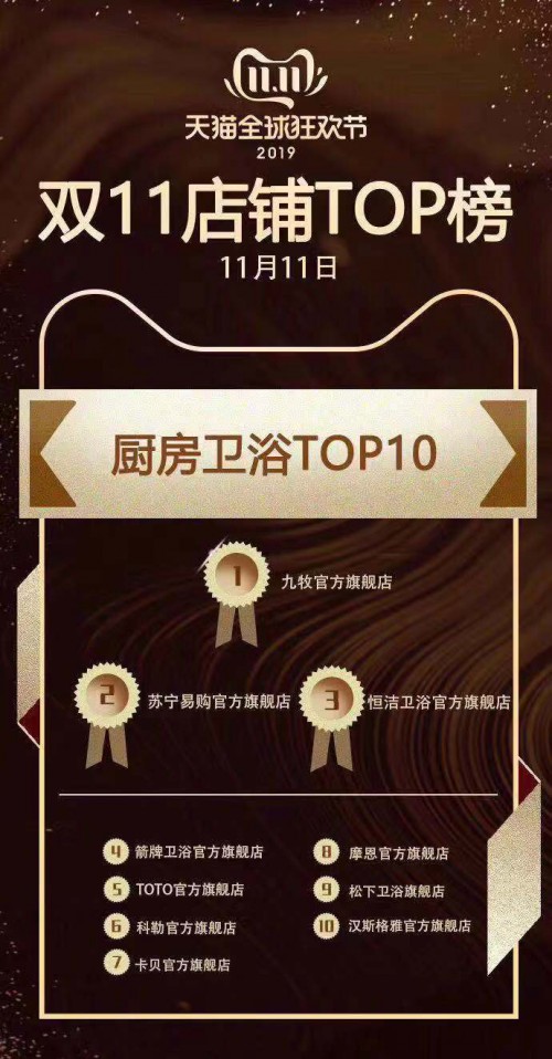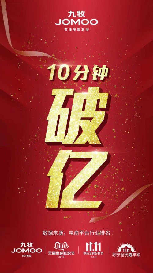 今年双11,九牧再一次用自身实力接连创造新纪录,蝉联家装卫浴行业十连冠!10分钟破亿,销售额比同期增长36%!