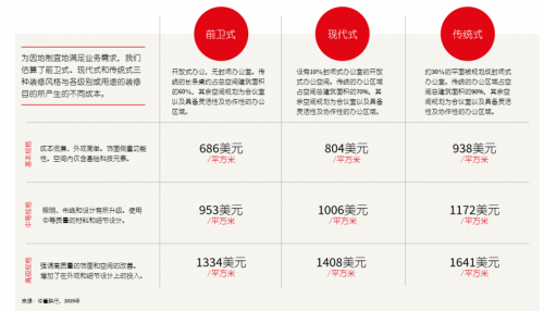 仲量联行中国区项目与开发管理服务部总监柯戴维(David Cole)指出:“在仲量联行的‘未来办公’调研中,许多企业不动产管理者对于‘改善员工在办公场所的人性化体验’方面,最希望在办公空间实现协作性和灵活性的提升。为此,越来越多的企业开始关注如何创建能够鼓励和支持员工互动及协作的办公环境,为员工提供更好的办公体验,以此来吸引和留住人才。前卫式装修因此在亚太区日益普遍。”这种新颖且前卫的办公室设计装修风格同样具有成本优势——对于一个中等建造规格的办公室而言,相较于沿用传统式装修,采用前卫式装修的平均成本降低约219美元/平方米。