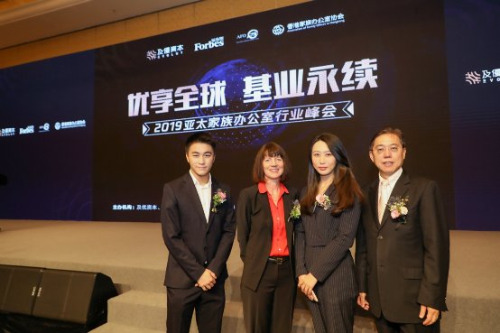 及优资本 CEO 宋卓韵(右二)与何猷君(左一)、福布斯国际集团总裁洪秋伟(右一)、福 布 斯 全 球 副 主 编 Kerry Dolan(左二 ) 在“2019 亚太家族办公室行业峰会”合影