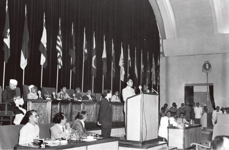 1955年4月,周恩来率中国代表团出席在印度尼西亚万隆召开的亚非会议。会议在和平共处五项原则基础上,提出处理国家间关系的十项原则,为推动国际关系朝着正确方向发展,为推动亚非合作、南南合作,为促进南北合作,发挥了重大历史性作用。这是新中国走上国际舞台进程中的重要里程碑。图为周恩来在万隆会议上发言。 新华社发