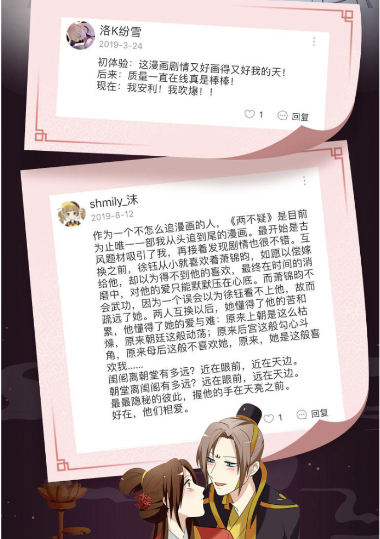 《两不疑》从2016年一直连载到2019年完结,每周一次更新,历时三年,男女主角之间波折不断的爱情线,让很多粉丝一次次被故事感动。很多《两不疑》的漫画粉丝纷纷表示,这是他们在追的第一部国产漫画,而几年的漫画更新也陪他们度过了一段非常美好的时光。