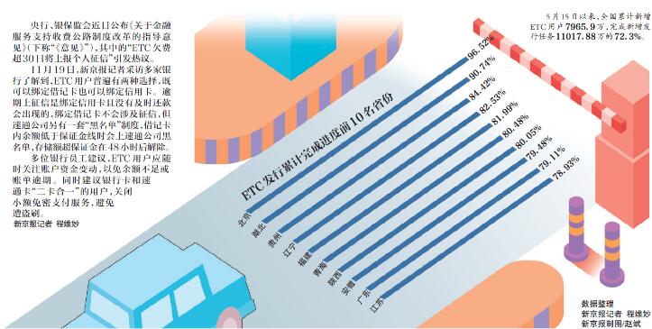 多家银行员工称:ETC绑定借记卡需留存保证金,借记卡保证金不足可能上速通公司“黑名单”;ETC用户要随时关注账户资金变动,绑定信用卡的关注账单情况;建议开通短信提醒;ETC联名卡要关闭小额免密支付服务。