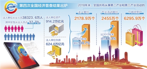 “从结果看,我国经济规模与上次经济普查相比有大幅度提高。”国家统计局新闻发言人毛盛勇说,近年来,我国不断推进“放管服”改革,深化商事制度改革,优化营商环境,推动大众创业、万众创新,市场环境更好,为企业的创立创新提供了更多便利条件。不管是企业法人单位数、产业活动单位数还是个体经营户数都出现了大幅增长。