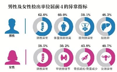 在体检筛查出的健康问题方面,颈椎异常的检出率最高,达到60.67%。此外,男性前列腺异常、甲状腺结节、体重指数增高、骨质疏松/骨量减少和女性宫颈异常成为较为突出的健康问题,检出率均超过40%。