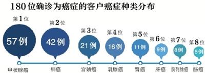 爱康集团对中国金融高净值客户开展追踪、随访,目前已经发现180位客户患有癌症(由医院诊断确诊),其中甲状腺癌57人、肺癌42人、宫颈癌21人、乳腺癌16人。张黎刚表示,很多肿瘤早期症状不明显,确诊时已经到了中晚期,“通过5年相对生存率的对比发现,早期癌症和晚期癌症的相对生存率差异非常大,以肺癌为例,体检筛查发现的癌症早期所占比例是门诊检查的4倍以上,体检筛查是发现早期癌症的重要手段。”