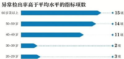 白皮书显示,60岁及以上年龄段中国金融高净值客户人群有15项指标异常检出率高于平均水平,40岁-49岁、50岁-59岁年龄段的中国金融高净值客户分别存在11项、14项指标异常检出率高于平均水平,在异常指标中,颈动脉异常、空腹血糖升高、高血压、男性前列腺异常等在40岁以后检出率增长幅度较大。