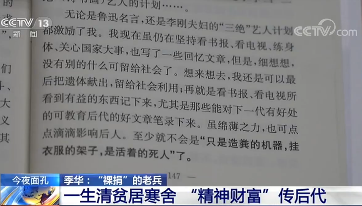 在书中老人写道:“我现在虽仍在看书报,看电视,练身体,关心国家大事,也写一些回忆文章,但是,细想想没有别的什么可以留给社会了。想来想去,我还是可以最后把遗体献出,留给社会利用,再就是看书报,看电视所看到的有益的东西记下来……虽绵薄之力,也可点点滴滴影响后人。”
