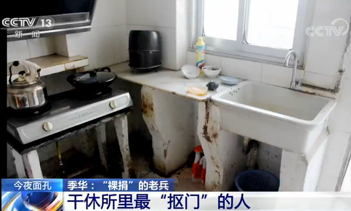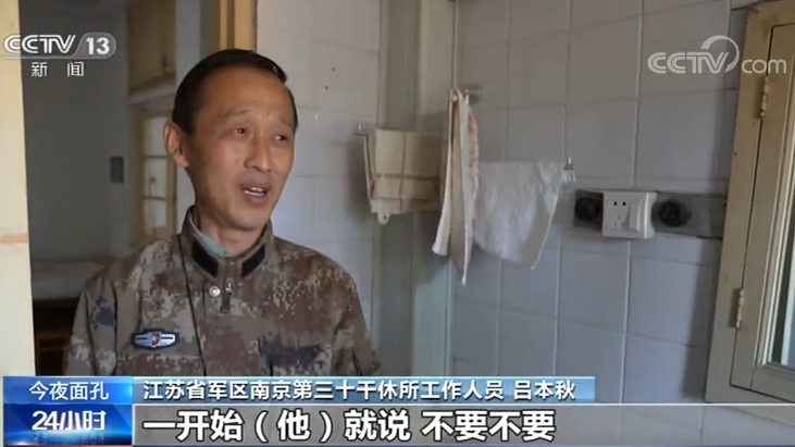 江苏省军区南京第三十干休所工作人员 吕本秋:上面都是空空的,洗澡就冷。一开始他就说,不要不要,很好很好,没事的。但是,我们看到他洗澡冻得抖了,我们忍心吗?就不忍心,大家伙一起来劝。对花钱这块,他很固执。他这个钱,他就不给你瞎花。