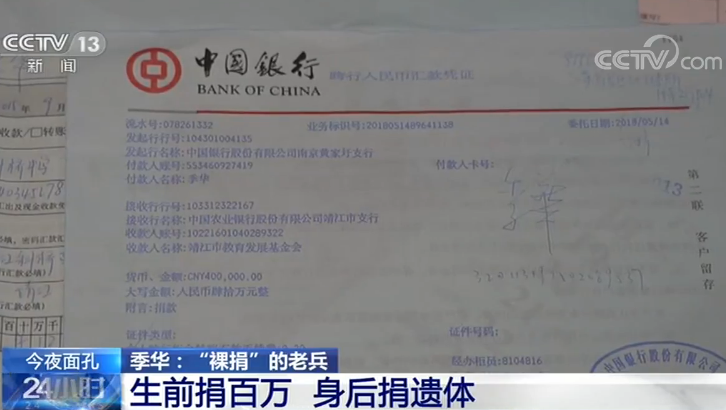 季华老人去世后,他的50万元抚恤金,除了24万元用于缴纳特殊党费和帮助老家的困难群众之外,剩下的26万元都捐给了老家靖江斜桥中学作为助学基金,加上之前的捐赠,季华老人已经向学校捐助了近70万元,而这也是斜桥中学目前接受个人捐款的最大数额。目前先期收到的40万捐款,学校已经陆续发放。
