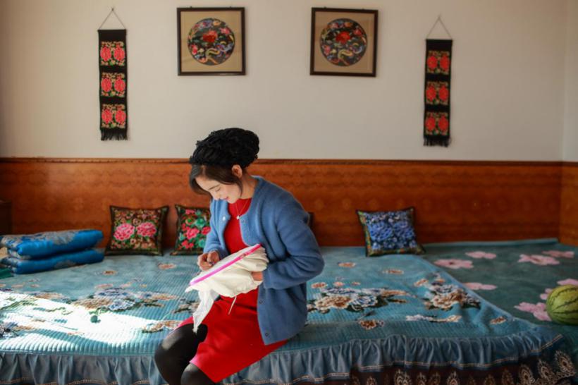 (阳光照进屋内,东乡美丽姑娘正在阳光下刺绣)