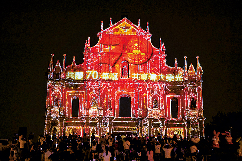 2019年9月30日晚,由澳门特区政府旅游局主办的“庆祝新中国成立70年大型灯光秀”,在澳门标志性建筑大三巴牌坊上演。这场灯光秀以大三巴牌坊为投影屏幕,用光影展现“共庆70华诞 共享伟大荣光”的主题。灯光秀现场璀璨斑斓,流光溢彩,呈现出一幅幅澳门社会喜迎国庆的画面,抒发澳门民众对祖国的热爱,对国家的祝福。 新华社记者 张金加/摄