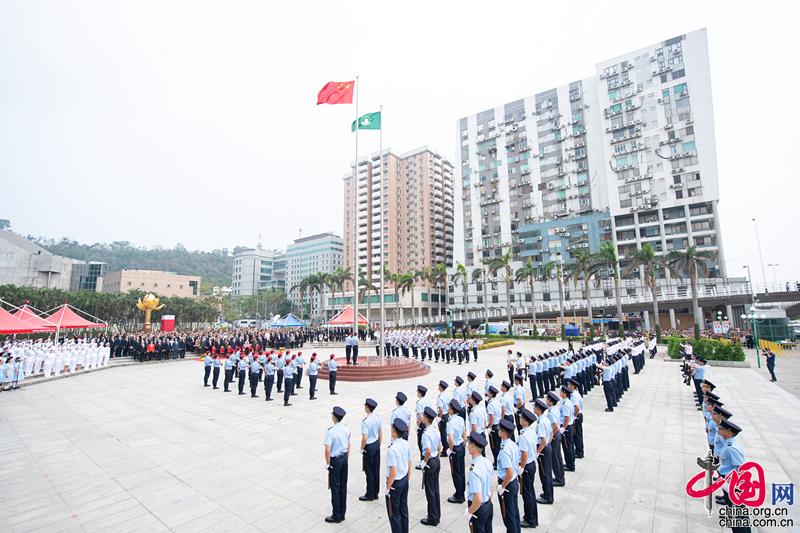 在拱北口岸粤澳边界线上,国家移民管理局珠海边检总站与澳门特区政府治安警察局共同举行“同升国旗共唱国歌”活动。张金加 摄
