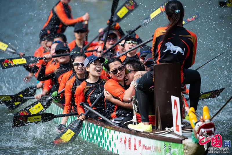 澳门国际龙舟赛获胜队庆祝胜利 张金加 摄