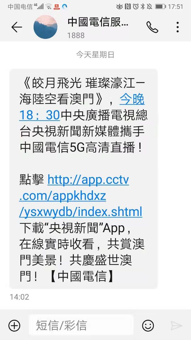 此次直播是全国首次5G高清跨境跨网直播,节目从海上、陆地、空中多角度对澳门实景进行了全方位的直播。直播多个地方通过中国电信5G网络进行传送,并由中国电信(澳门)公司进行技术支持和保障。除在央视新闻上实时直播外,信号还同步接入了中国电信澳门皇朝旗舰店的高清大屏。