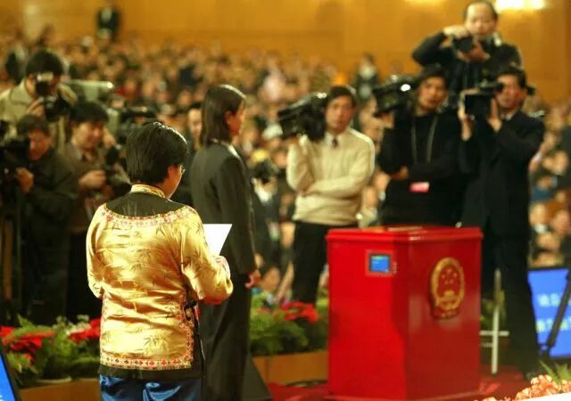 2003年3月,十届全国人大一次会议上,使用智能电子票箱。智能电子票箱能容纳1000张选票,能快速读出各种选举数据,再将这些数据传输到后台的统计系统。(新华社记者兰红光摄)