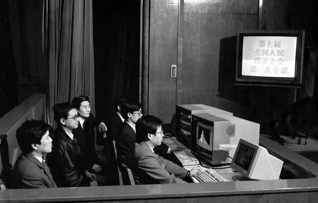 1990年3月,工作人员在七届全国人大三次会议上监视电子表决系统的运转情况。这套电子表决系统有报到、表决和即席发言3种功能。(新华社记者汤孟宗摄)