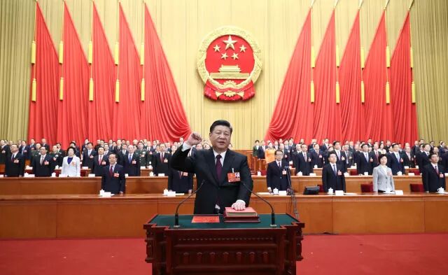 2018年3月17日,十三届全国人大一次会议在北京人民大会堂举行第五次全体会议。习近平当选中华人民共和国主席、中华人民共和国中央军事委员会主席。这是习近平进行宪法宣誓。(新华社记者鞠鹏摄)