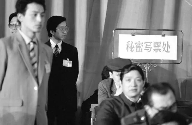 1988年4月,七届全国人大一次会议第六次全体会议,投票选举国家机构领导人。图为首次设立的秘密写票处。(新华社记者李平摄)