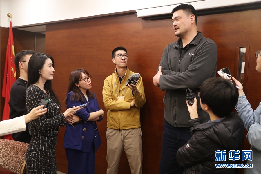 3月10日,全国政协委员、中国篮球协会主席姚明在北京会议中心接受媒体访问。图为姚明回答记者提问。新华网 章佳礼 摄