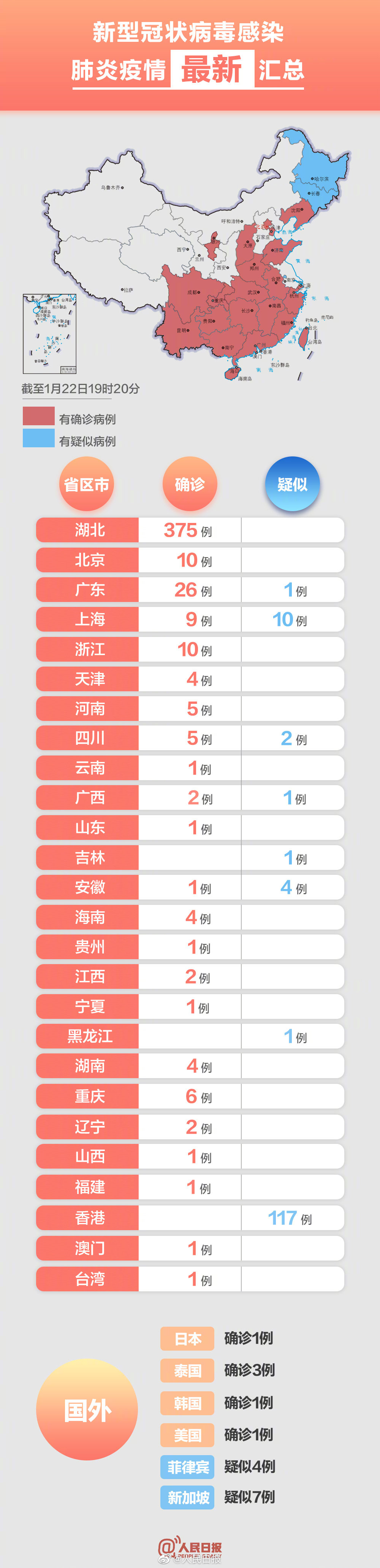 新型肺炎疫情最新汇总:截至1月22日19时20分,全国新型冠状病毒感染肺炎确诊473例。