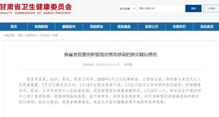 中新网1月23日电 据甘肃省卫健委网站23日消息,甘肃省发现首例新型冠状病毒感染的肺炎疑似病例。