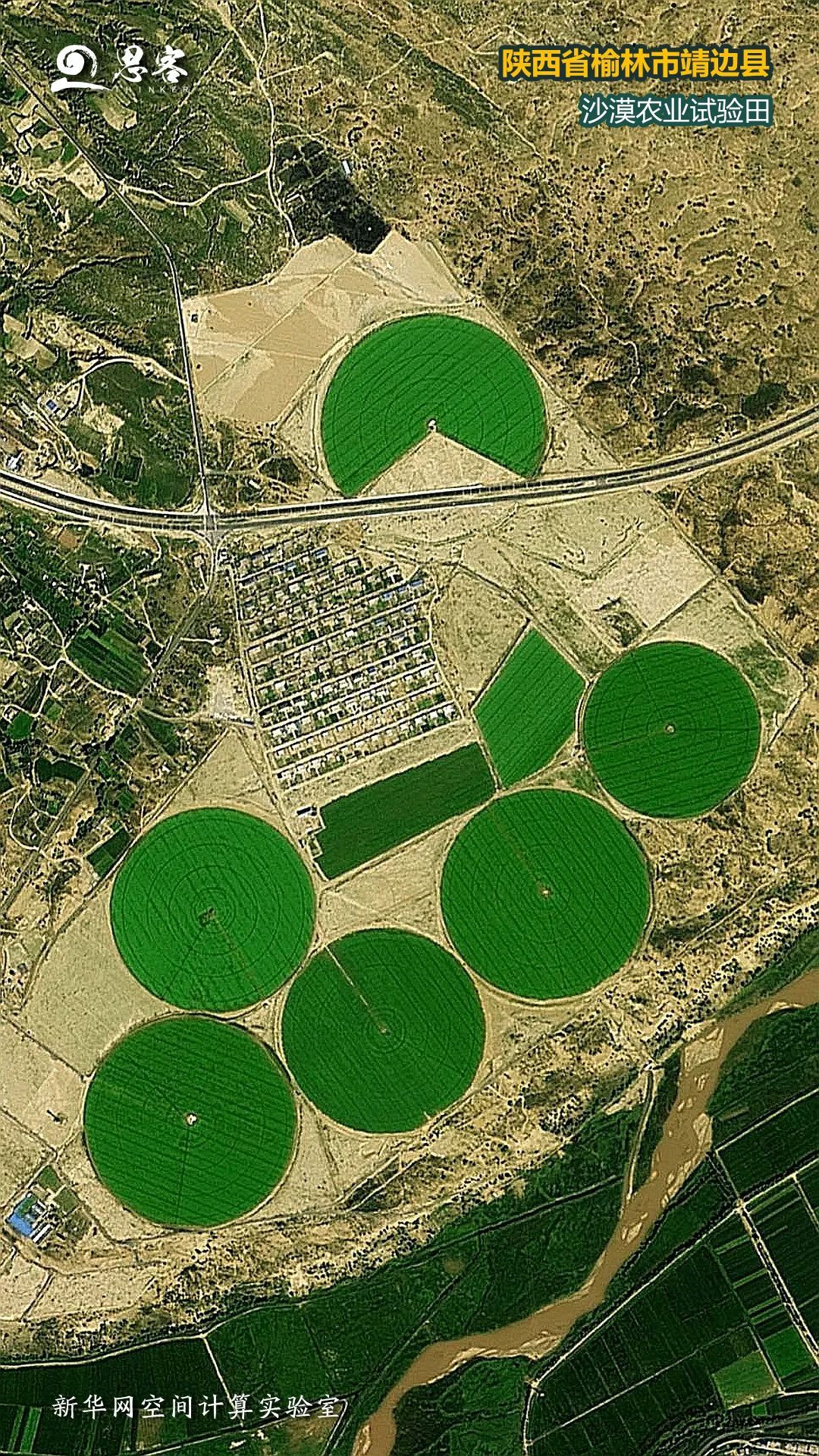 ▲图为陕西榆林靖边沙漠农业试验田,曾经的沙地正在“变身”陕西大粮仓。卫星资料来源:天地图
