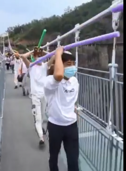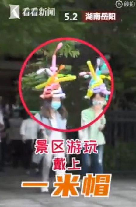 5月2日,在湖南岳阳平江石牛寨景区,游客们都戴上了有趣的“一米帽”来保持人员之间的安全距离,以确保疫情防控的要求。所谓的“一米帽”其实就是普通的帽子上绑了一根1米长的塑料棒或者长条气球。据景区工作人员表示,当天给排队的游客都免费发放了“一米帽”,提醒大家有序游玩。