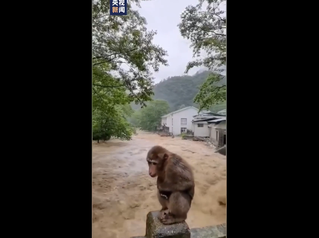 【#武夷山暴雨中猴子蹲桥上避险#】今天(9日),福建武夷山遭遇暴雨袭击,局地有特大暴雨,位于武夷山国家公园的桐木村水位暴涨。经常在附近出没的猴子,也蹲在桥上避险。(总台央视记者林舟)