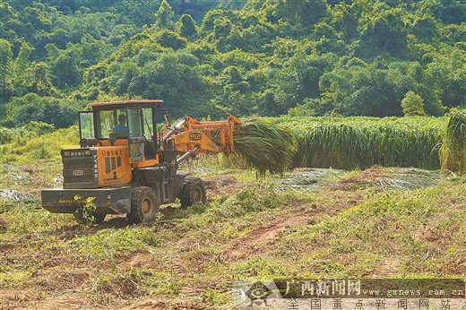 在崇左市龙州县下冻镇扶伦村那渠屯甘牛生态养殖基地,养殖技术带头人在驾驶机械收割草料。广西日报记者 何学俏 摄