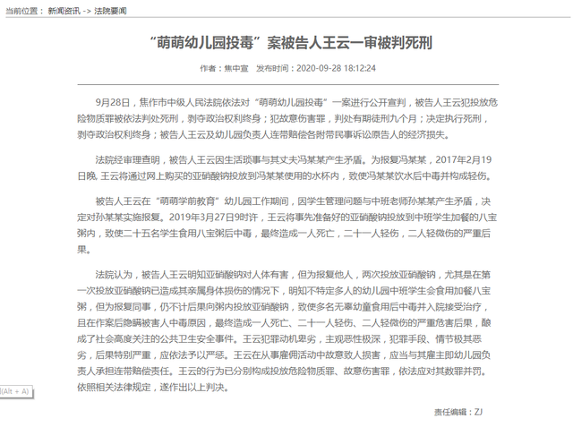 2020年9月28日,焦作市中级法院在官网通报称,该院已对“萌萌幼儿园投毒”一案进行公开宣判,被告人王云犯投放危险物质罪被依法判处死刑,剥夺政治权利终身;犯故意伤害罪,判处有期徒刑九个月;决定执行死刑,剥夺政治权利终身;被告人王云及幼儿园负责人连带赔偿各附带民事诉讼原告人的经济损失。