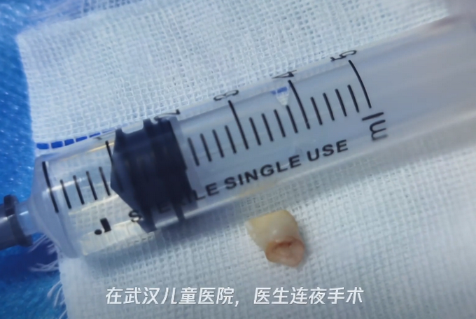 之后嘉嘉开始咳嗽,特别是放学路上跑几步,就咳得更厉害。在家附近医院查血象,显示炎症指数较高,连打了几天针也没见好。结合病史,医生推测很可能是牙齿呛咳进了气管,建议尽快转往武汉儿童医院。12月15日晚,一家人带着嘉嘉来到武汉儿童医院。