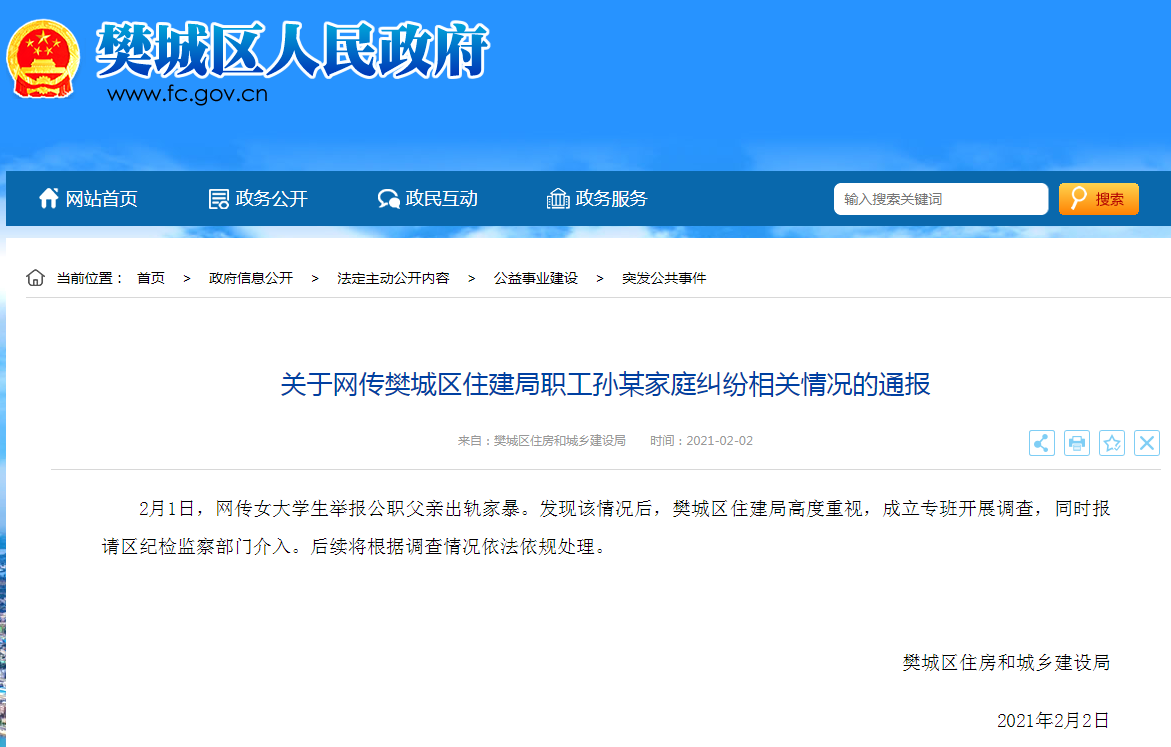 湖北省襄阳市樊城区政府网站2月2日发布关于网传樊城区住建局职工孙某家庭纠纷相关情况的通报,以下是通报全文。