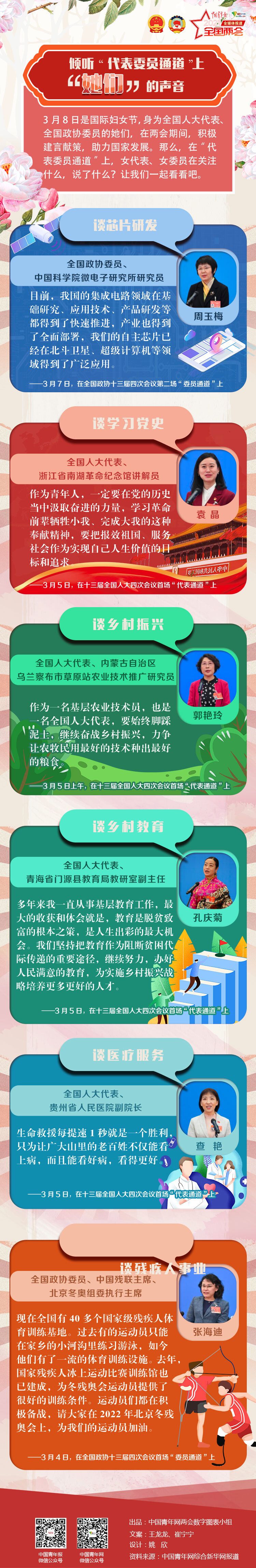 中国青年网北京3月8日电 3月8日是国际妇女节,身为全国人大代表、全国政协委员的她们,在两会期间,积极建言献策,助力国家发展。那么,在“代表委员通道”上,女代表、女委员在关注什么,说了什么?让我们一起看看吧。