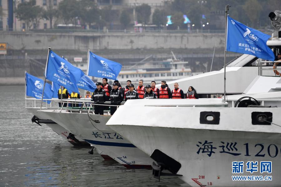 执法船队在重庆江北嘴执法船舶码头整装待发(2020年12月31日摄)。当日,长江流域重点水域“十年禁渔”全面启动活动(重庆分会场)在重庆江北嘴执法船舶码头举行。长江流域重点水域于2021年1月1日零时起正式进入“十年禁渔期”。新华社记者 唐奕 摄