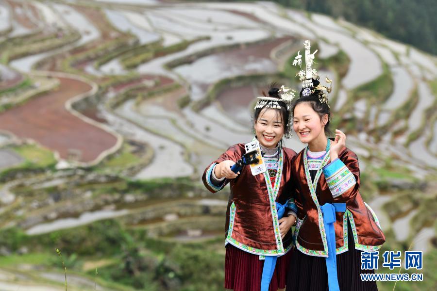 在贵州省从江县加榜乡加车村,脱贫攻坚指挥所网格员吴贤艳(左)与村里的大一女生梁琼英在直播推介加榜梯田风光(2020年4月19日摄)。新华社记者 杨文斌 摄