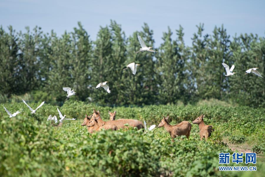 这是在湖南岳阳东洞庭湖麋鹿和鸟类救治避难中心拍摄的麋鹿和飞鸟(2020年8月7日摄)。位于湖南省岳阳市的东洞庭湖麋鹿和鸟类救治避难中心成立于2016年9月,占地400余亩,中心自建成后就承担起东洞庭湖区域全部麋鹿的救援、医治、康复和喂养任务。新华社记者 陈思汗 摄