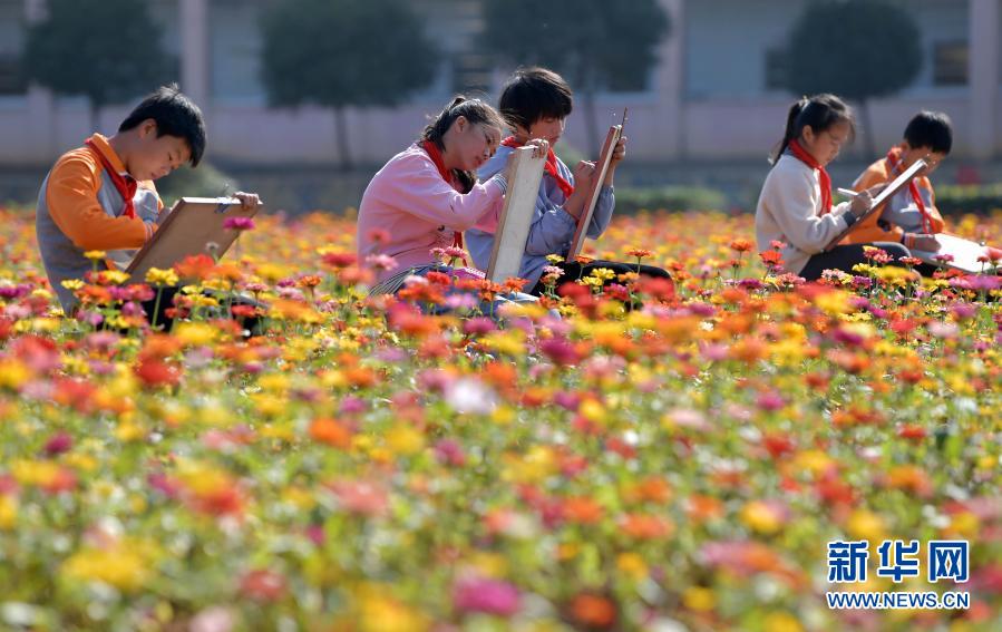 江西省宜春市袁州区寨下中心小学学生在花海上美术课(2020年11月9日摄)。为了更好守护这片绿,师生一起加入“护花使者”队伍,扛着锄头拎着桶,锄草、松土、浇水……师生们共同的汗水浇灌了这片花田,大家都很爱护它。新华社记者 彭昭之 摄