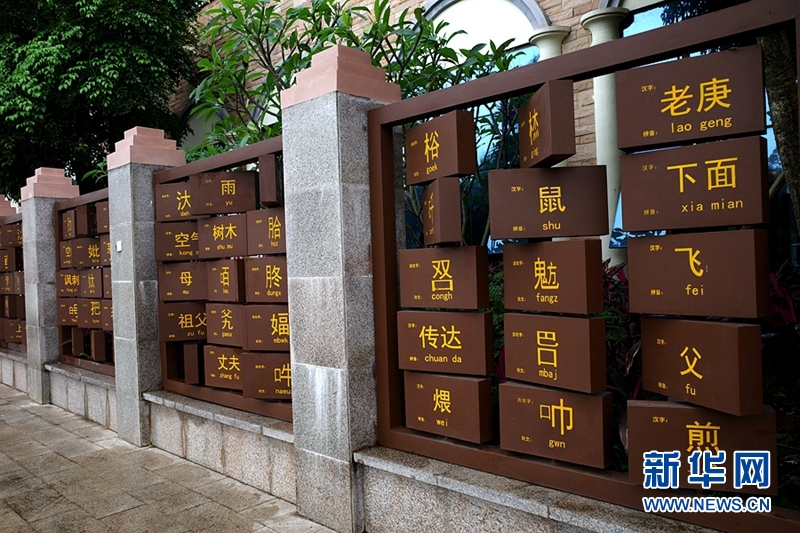 那马服务区的广场一角,用木格印刷的方式创意展示汉、壮两种语言文化,其中一面印有汉字和拼音,另一面印有相同字义的古壮字和壮文。新华网聂晨静 摄