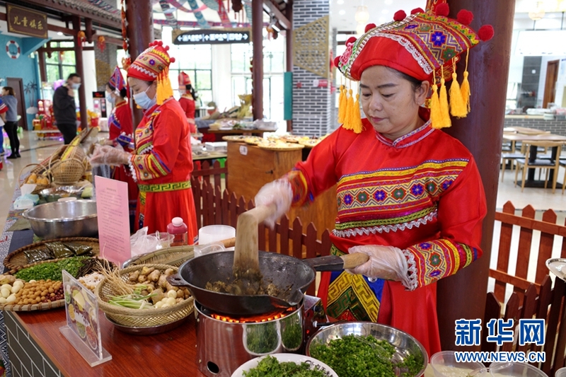 在那马服务区主体综合楼一层大厅内,身着民族服装的工作人员正在制作当地特色美食——油茶。新华网聂晨静 摄