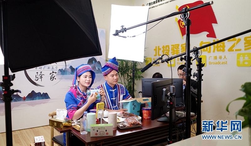 在那马服务区“党团志愿服务台”,工作人员通过直播带货的方式,为当地扶贫企业农产品开辟线上销路。新华网聂晨静 摄
