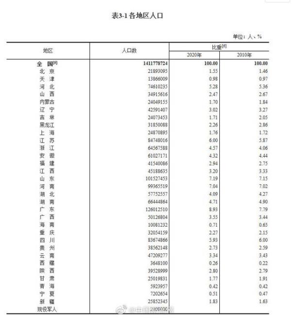 国家统计局11日公布第七次全国人口普查主要数据结果。31个省份中,人口超过1亿人的省份有2个,分别为广东(126012510人)和山东(101527453人)。在5000万人至1亿人之间的省份有9个,在1000万人至5000万人之间的省份有17个,少于1000万人的省份有3个。