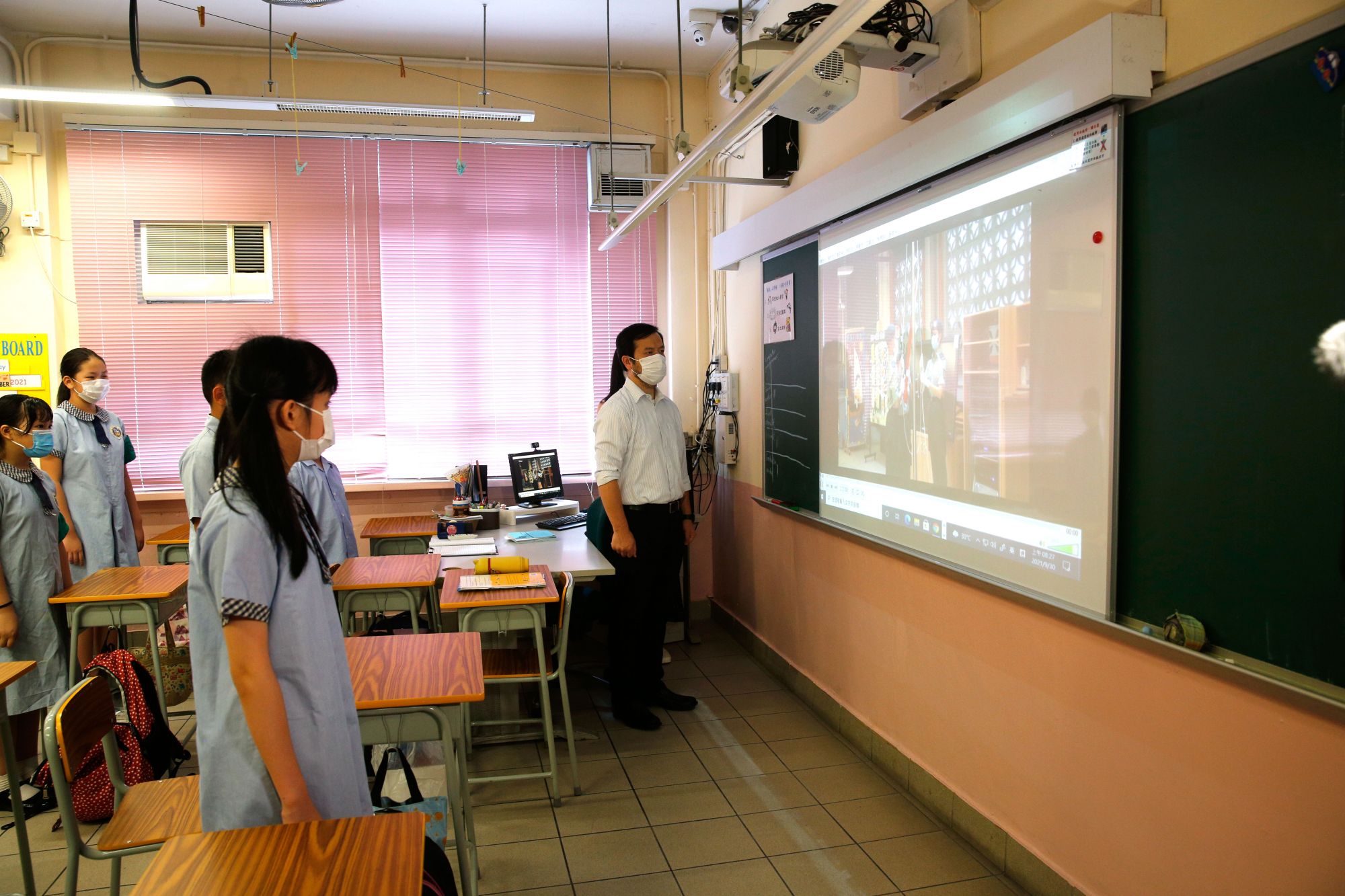 9月30日8点15分,国歌声响彻香港鲜鱼行学校。每间教室里的师生,都向投影幕布上的国旗行注目礼。投影仪播放的是香港青少年军升旗手在学校礼堂升挂国旗的画面。由于疫情,原本在礼堂举行的升旗仪式以这样特别的方式挪到了教室。而更早以前,学校甚至没有流动旗杆可以在礼堂升旗。