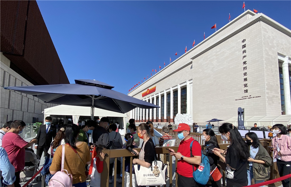 10月1日,人们在中国共产党历史展览馆入口处排队入馆。新华社记者 李贺 摄