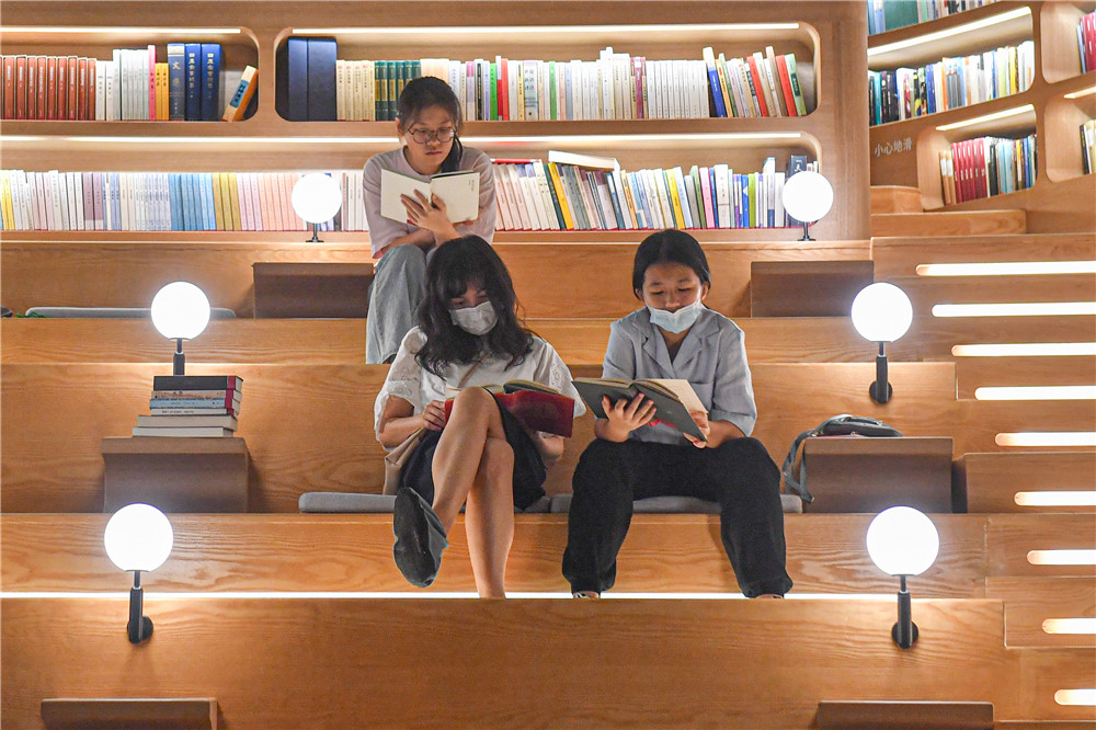 10月1日晚,读者在海口市海口湾云洞图书馆阅读。新华社记者 蒲晓旭 摄