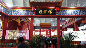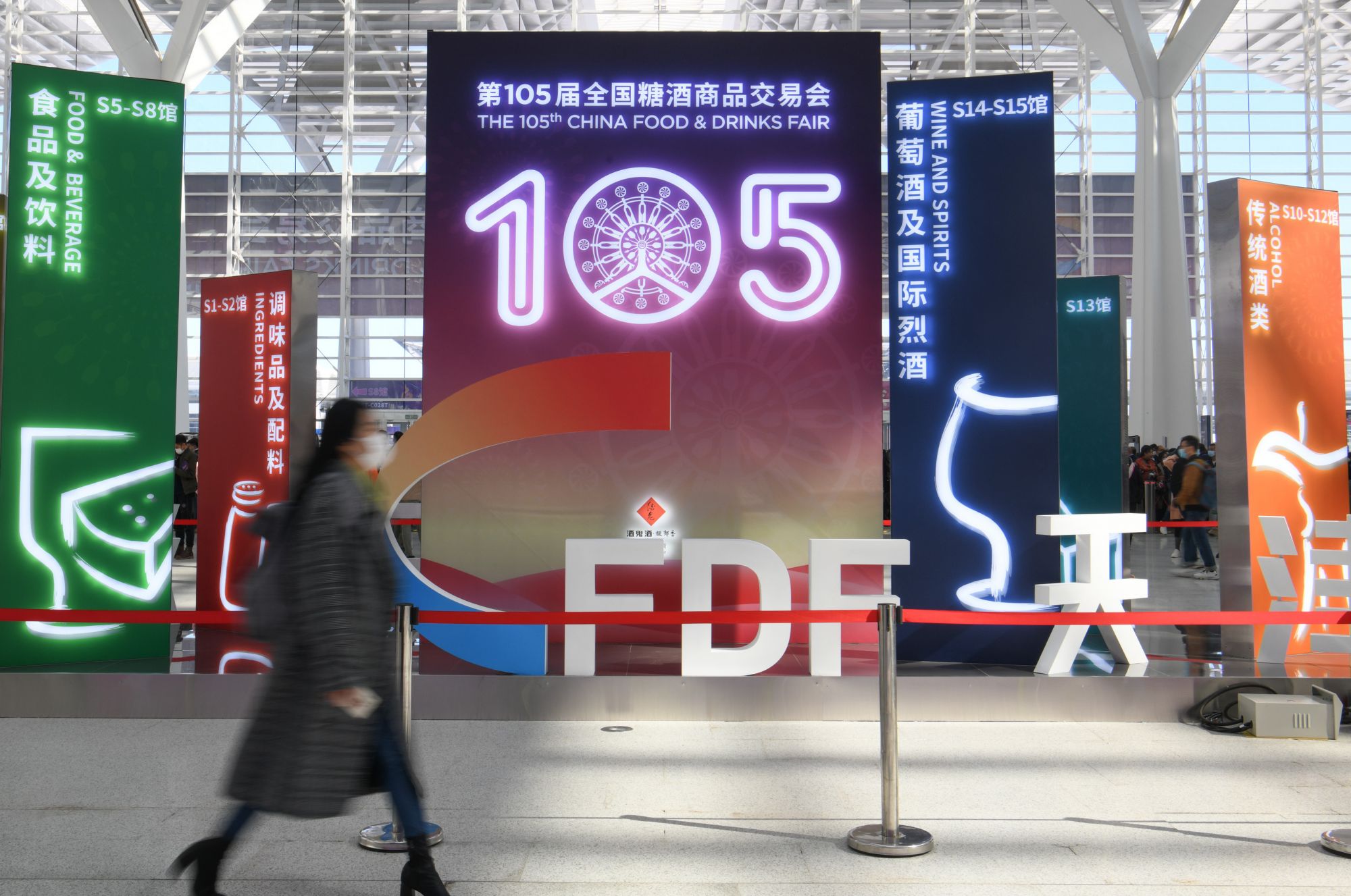 10月19日,观众从第105届全国糖酒商品交易会宣传展板前走过。