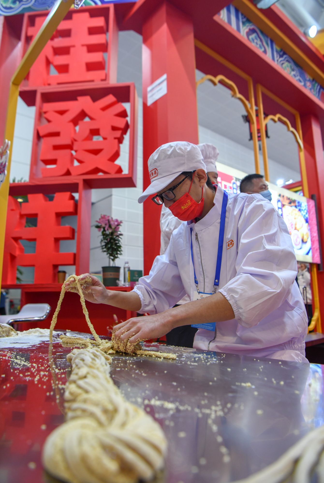 10月19日,桂发祥参展人员现场演示制作麻花。