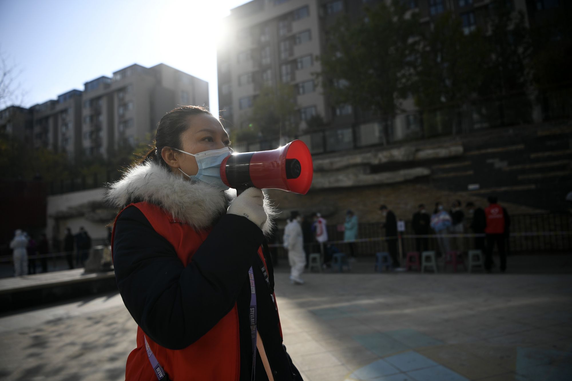 宁夏银川市兴庆区京能天下川小区核酸采样点,志愿者在用扩音器提醒排队的居民注意保持距离。新华社记者王鹏 摄
