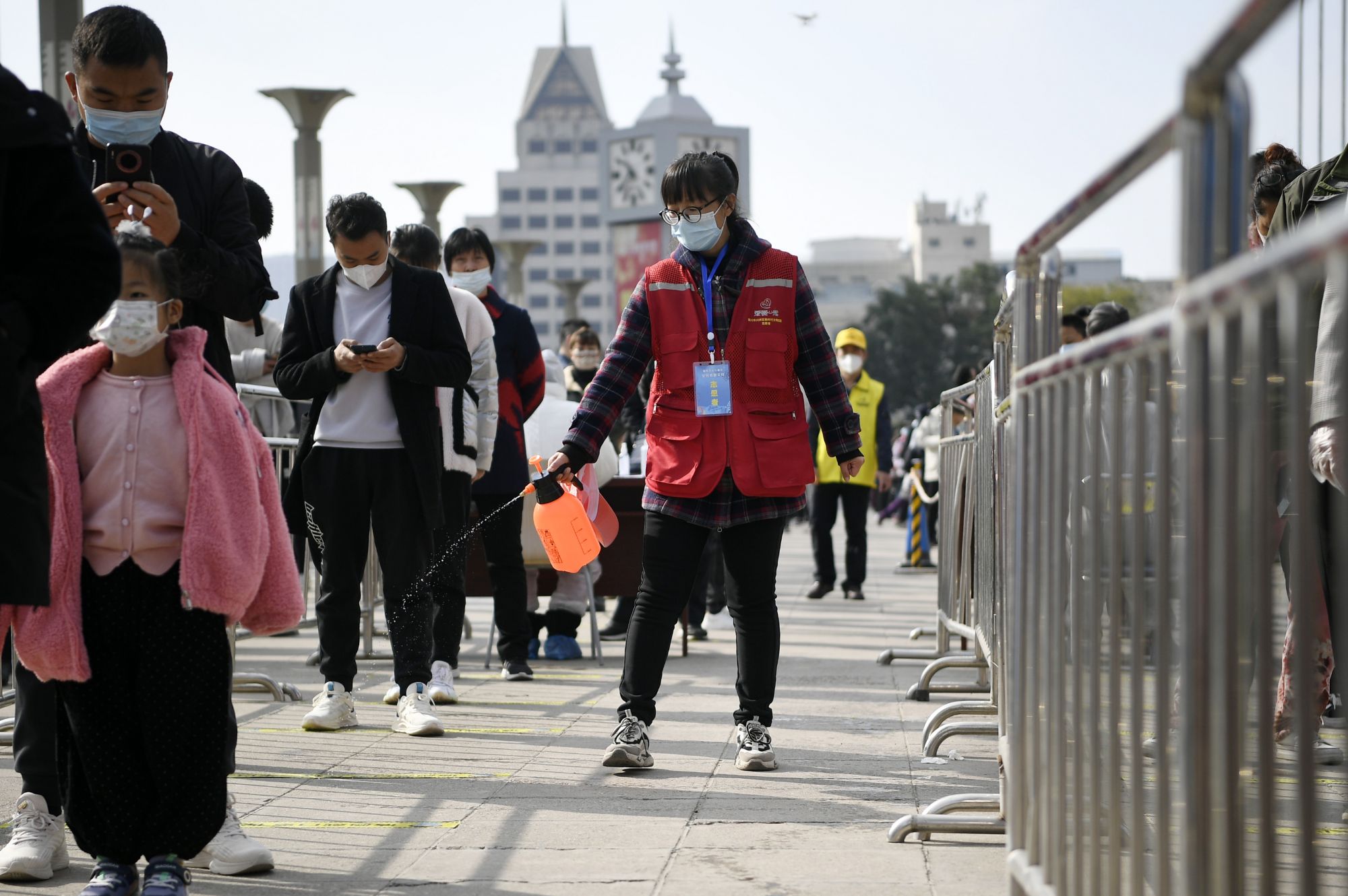 宁夏银川市兴庆区光明广场核酸采样点,志愿者进行消毒工作。新华社记者王鹏 摄