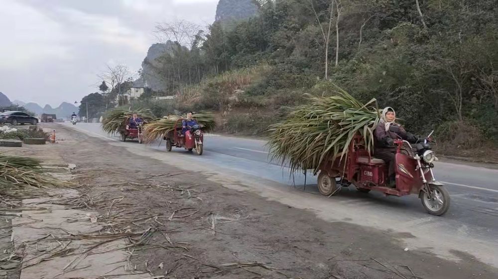 多位村民用三轮车将自家的甘蔗尾叶运来销售。新华社记者覃星星摄